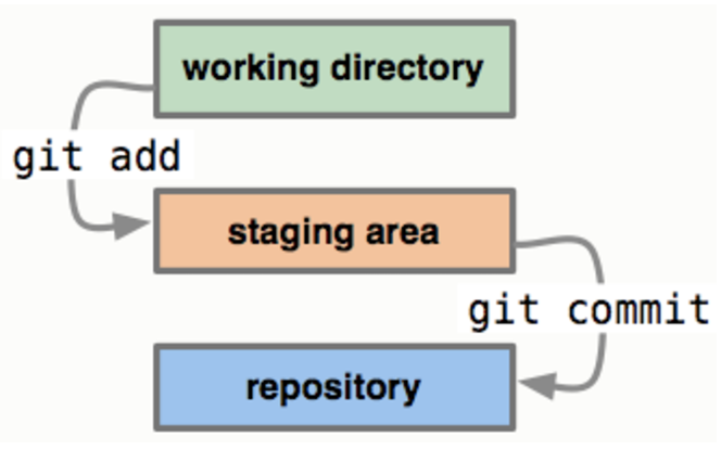 En la imagen de referencia se describen tres estados: el working directory, este es el sistema de archivos en el cual trabajamos, el staging area, un área temporal en el que añadimos los archivos cuyos cambios estamos por enviar a git y el repository, donde se versiona nuestro trabajo.