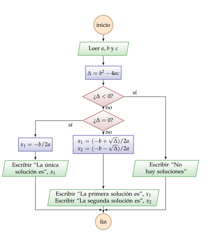 La entrada del algoritmo, pues, son los valores \(a, b\) y \(c\), y la salida son las raíces reales \(x\) (que pueden ser cero, una o dos) de la ecuación. En un programa computacional, los valores de \(a, b\) y \(c\) deberían ser ingresados usando el teclado, y las soluciones \(x\) deberían ser mostradas a continuación en la pantalla.